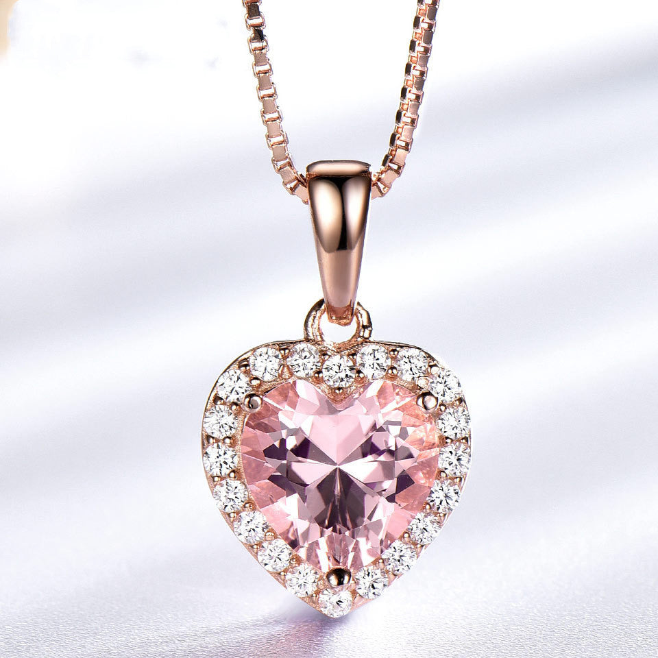 925 Sterling Silver Pendant Womens Fashion Rose Morganite Charm Heart Pendant